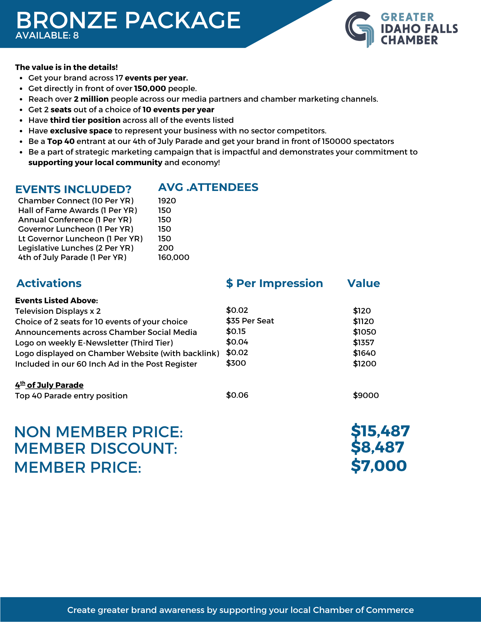 The Greater Idaho Falls Chamber has long been a cornerstone of economic progress—supporting entrepreneurs, building partnerships, and driving community growth that still benefits us today. As a Bronze Annual Sponsor, your business helps sustain that rich legacy while gaining valuable visibility and networking opportunities throughout the year. Your investment supports programs that strengthen local business, enhance workforce development, and foster innovation. Becoming a Bronze Sponsor means you’re not only benefiting from the Chamber’s decades of impact—you’re helping to ensure that the next generation of businesses and community leaders thrive in the years ahead.
